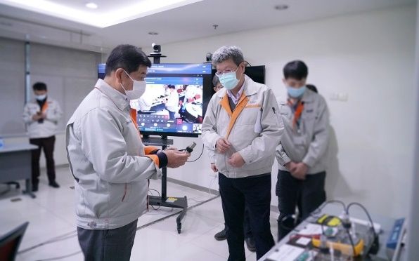 图注:金原庆武总裁与黄意隆技术副总裁观摩现场实物模拟演示