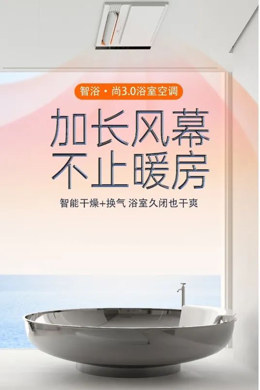 智浴尚3.0浴室空调,超宽出风口,大功率急速制暖,用温暖包裹全身,沐浴零等待,根据不同用户需求,搭配各种风格的浴室吊顶,让你的冬日浴室既温暖又不失美感,寒冷冬季,享受温暖沐浴。
