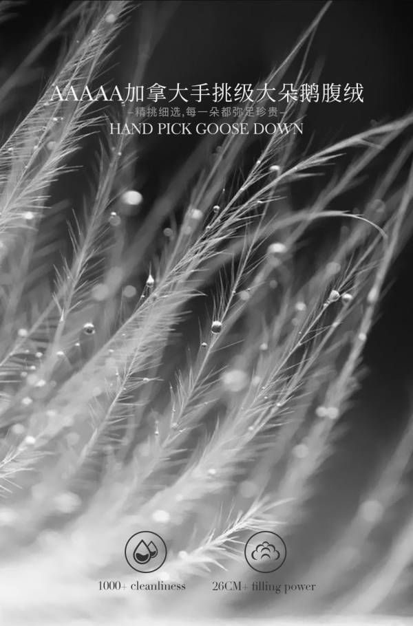 精选加拿大鹅腹绒,每一朵都弥足珍贵。作为鹅绒中的“绿色宝石”产地,加拿大出台了严格的动物保护法,规定鹅绒要在生长期满450天以上才可采集,因此产生的绒朵极大,是其他鹅绒的两倍。蓬松度可达800+。