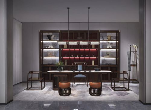 茶台选用名贵的非洲加蓬黑檀木(学名爱里古夷苏木)与石面拼接而成,扶手椅框架极简,将中式风骨与现代审美完美融合。