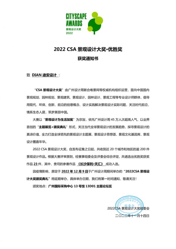 近日,2022 CSA景观设计大赛获奖名单隆重揭晓,迪安设计的【长沙保利·天汇】以创新景观设计之美和人性化细节,赢得评委的一致青睐,一举斩获优胜奖。