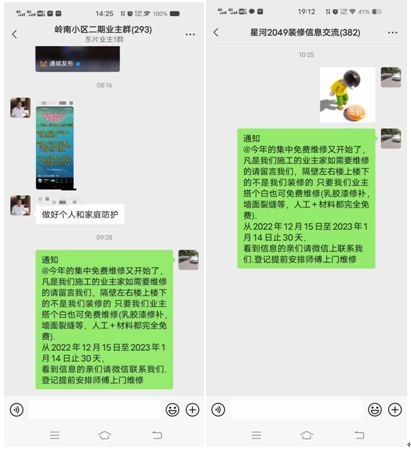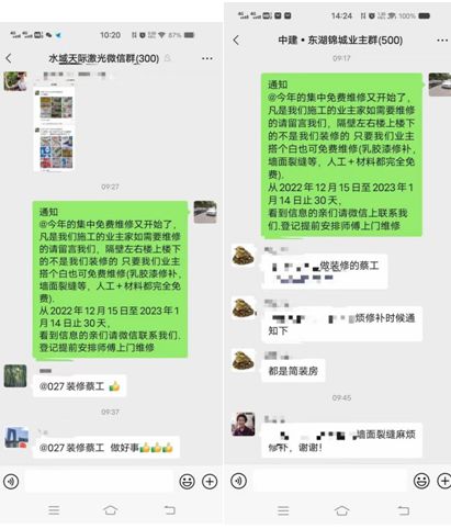 年底推出“集中免费维修”有着天然好处,装修经过了一个夏天,该裂的也都裂了,正是维修的最佳时机,经过此次维修之后房屋基本就稳定了,而且业主选择这时候维修,过年的时候也能让家里整齐干净,所以群里的业主们也会积极报名。