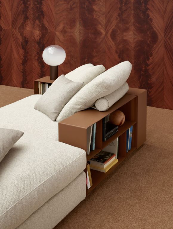 Groundpiece的皮质金属扶手,宛如精华版的博物架。在随心放置书籍、装饰物的同时作为收纳架使用。这种将柔软沙发与硬质书架相结合的方式,不仅充分展现了其高实用性,同时还将软硬并峙,将对比交融的视觉观感发挥到了极致。