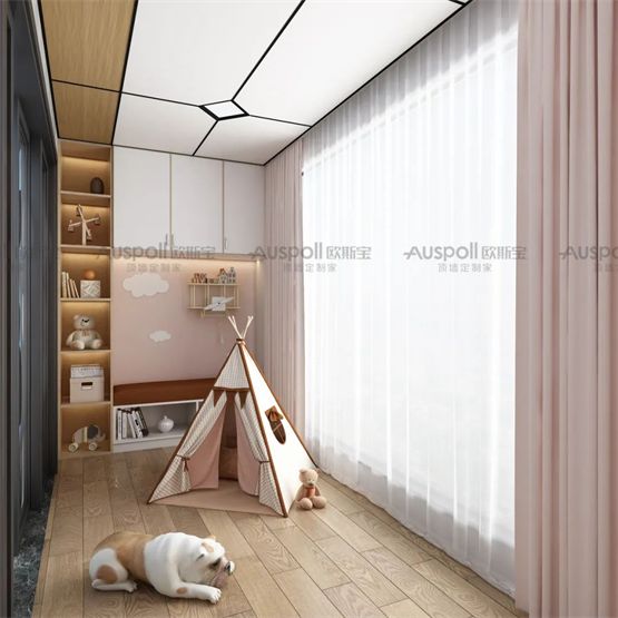 如果你家有双阳台,一个阳台打造成晾晒阳台,另一个阳台也别浪费了,可以打造成儿童阳台,阳台一边做定制阳台收纳柜,一边书桌布局,学习空间放在光线最好的地方,放上小帐篷,小孩平时游戏玩耍都是不错的地方。