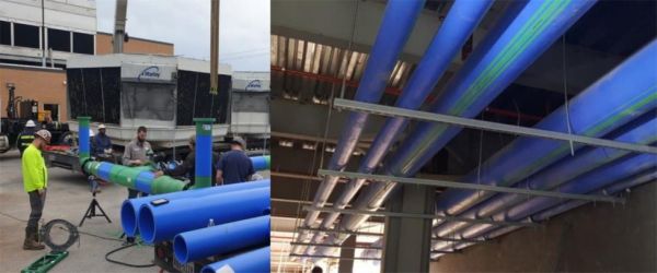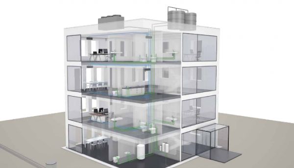 这里所指的是水系统中央空调系统。其运行原理与氟系统空调有着显著的区别,主要由制冷机、冷却水循环系统、冷冻水循环系统、风机盘管系统和冷却塔组成。由于运行原理和结构的特性,水系统空调需要运用大量的管道对水进行传输和循环。不断的水循环和温度变化,使得水机空调对管道的稳定性有着较高的要求。而PPR管耐腐蚀、耐高低温、抗蠕变性能较强、安装和维护便利等特点,很好的符合了水系统中央空调的使用需求。