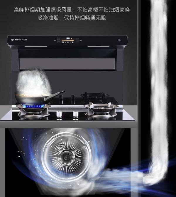 吸油烟设备最重要的功能是什么?那就是吸油烟。所以吸油烟的能力怎么样,直接体现了厨房电器怎么样。博净分体式集成灶侧吸下排的设计,近距离吸油烟,防止油烟升腾扩散,大大增强了油烟吸净率,排烟能力更出众。