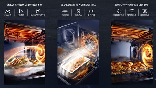 3D立体加热技术,大功率加热盘瞬间产生大量蒸汽,结合烤箱性能,顶部利用烤管辅热,使得底部蒸汽到达顶部时,获得二次受热。上下双重加热,形成360°包覆式均温蒸汽。蒸汽动态平衡+蒸汽后排技术,能保持内部蒸汽持续循环,食材不串味,顶部不滴水,保证原汁原味!