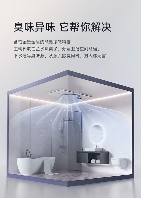 事实上,目前市面上浴霸产品给出的除菌除臭的方式存在诸多缺陷,例如高温除菌会导致有烫伤风险、香薰除臭只能掩盖气味而不能消除气味等。