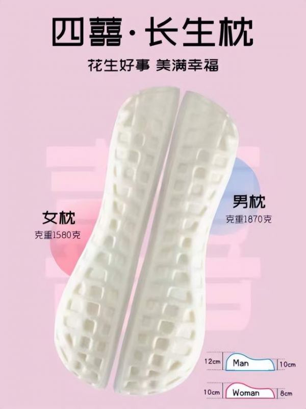 说起四囍·长生枕,其实最早的时候是舒适睡眠品牌比浮梦想打造的一款卓越舒睡体感的科技枕头。凭借研发团队10几年来对国内外家居品牌的研发制造经验,这款枕头几乎涵盖了目前市面上绝大多数的前沿记忆棉体感技术,有双密度打造的支撑层+舒适层的无缝结合,保证了既有乳胶的支撑性能,还有记忆棉的舒适性能;内置高分子凝胶技术;冬夏双枕套:冰丝技术+3D支撑枕套技术;高弹记忆棉技术的云浮棉等等,它还通过了有严格要求的CertiPUR-US认证,还有美国农业部有机棉认证,SGS等等,想着这样一款能够超越欧美一线睡眠家居品牌的中国原创睡眠科技产品,应该可以有更深层次的产品价值,更代表中国制造。研发团队想到了健康与美好的结合主题,然后设计师连夜绘制出了花生形状,一个枕头是一半的花生形状,一对枕头合起来就是一颗完整的花生,符合中国人的“千年修得共枕眠”的寓意。