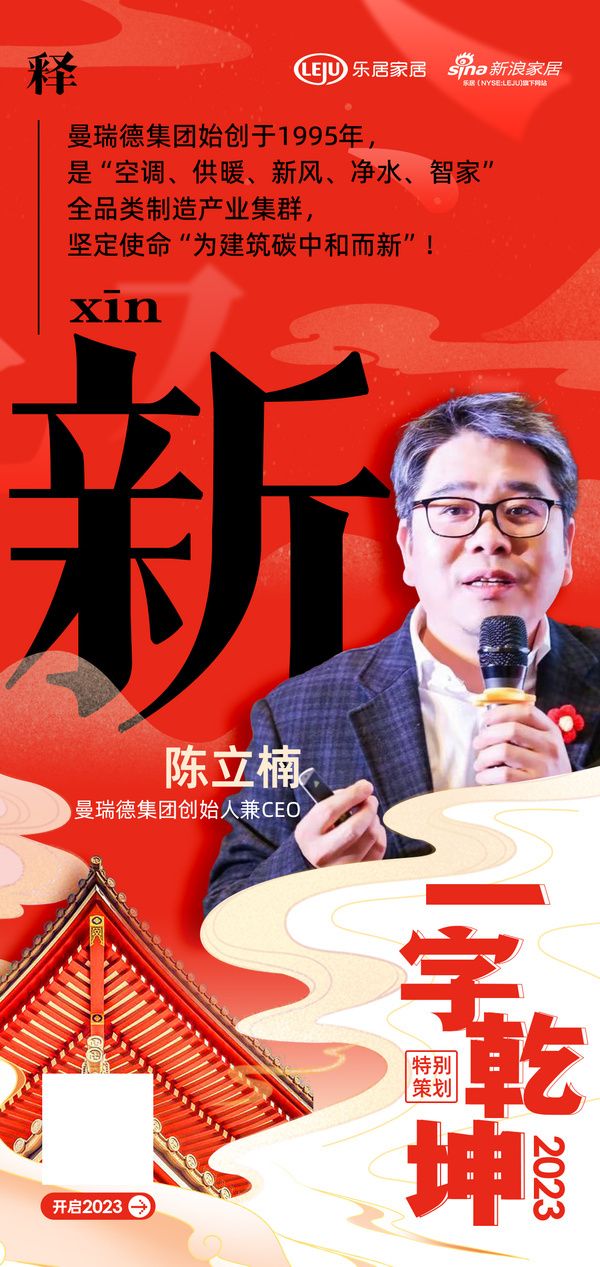 在“2023 一字乾坤”活动中,曼瑞德集团创始人兼CEO陈立楠用「新」字表达了2023年的规划策略及目标:通过“空调、供暖、新风、净水、智家”全品类制造产业集群,坚定使命“为建筑碳中和而新”!