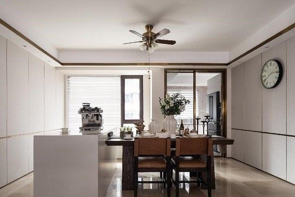 餐桌紧靠白色中岛台,灵活增加空间利用率,也让两种视觉感受擦出新的火花。餐桌本身可拉伸的设计,也能适应单向延伸的应用场景,让节日的欢聚时刻不会显得拥挤。