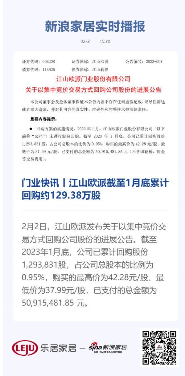 2月2日,江山欧派发布关于以集中竞价交易方式回购公司股份的进展公告。截至 2023年1月底,公司已累计回购股份1,293,831股,占公司总股本的比例为0.95%,购买的最高价为42.28元/股、最低价为37.99元/股,已支付的总金额为50,915,481.85元。