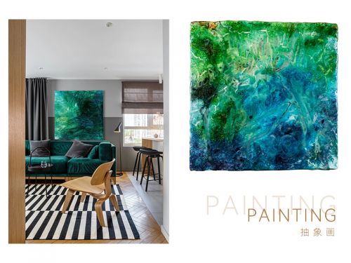 清新的绿,总能让人安静下来感受生活,也是家中彰显春意的不二选择。采用特殊手法和颜料制成的抽象画,看似随意晕染,却在明快清新中带有一丝华丽的优雅。蓝绿相融,暗黑与嫩黄夹杂,如同把一片广域的富氧森林引入家中,令人神清气爽。它的存在,令高贵的丝绒沙发和休闲的原木椅和谐融为一体,使空间呈现出富有生机的场域氛围。