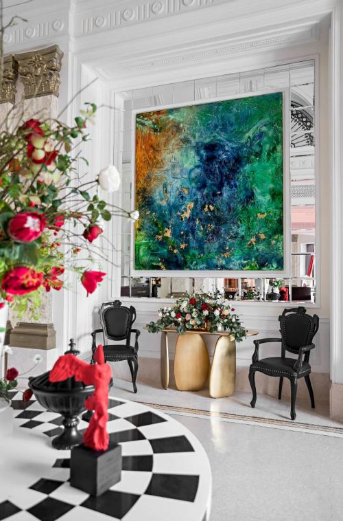 在风情万种的法式空间中,绿色主题抽象画同样可以将春意发挥地淋漓尽致。选择略带洒金色的绿色挂画,与金色桌体相衬,再摆放一些暖色鲜花,看似对撞的两种色彩完美相融,浓烈浪漫,带来非同寻常的视觉效果。