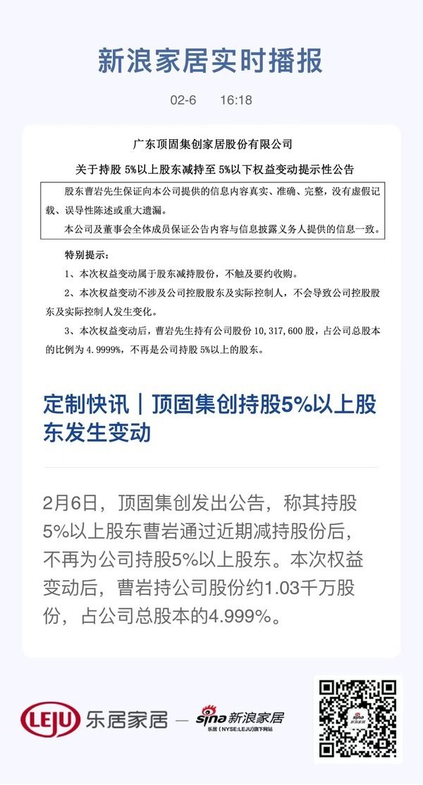 新浪定制家居讯2月6日,顶固集创发出公告,称其持股5%以上股东曹岩通过近期减持股份后,不再为公司持股5%以上股东。本次权益变动后,曹岩持公司股份约1.03千万股份,占公司总股本的4.999%。