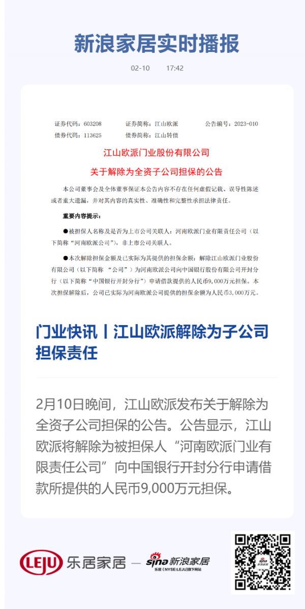 2月10日晚间,江山欧派发布关于解除为全资子公司担保的公告。公告显示,江山欧派将解除为被担保人“河南欧派门业有限责任公司”向中国银行开封分行申请借款所提供的人民币9,000万元担保。