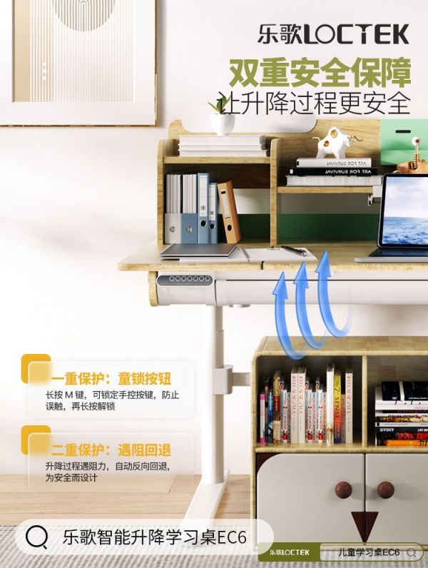 此外,乐歌智能升降学习桌配备的童锁功能,可以有效规避误触带来的安全隐患,让儿童用户使用的时候也确保绝对安全。其内置的六轴传感器在当感应到物品阻碍或人为撞击时,会立即启动反向回弹机制,最大程度保障使用者的安全。