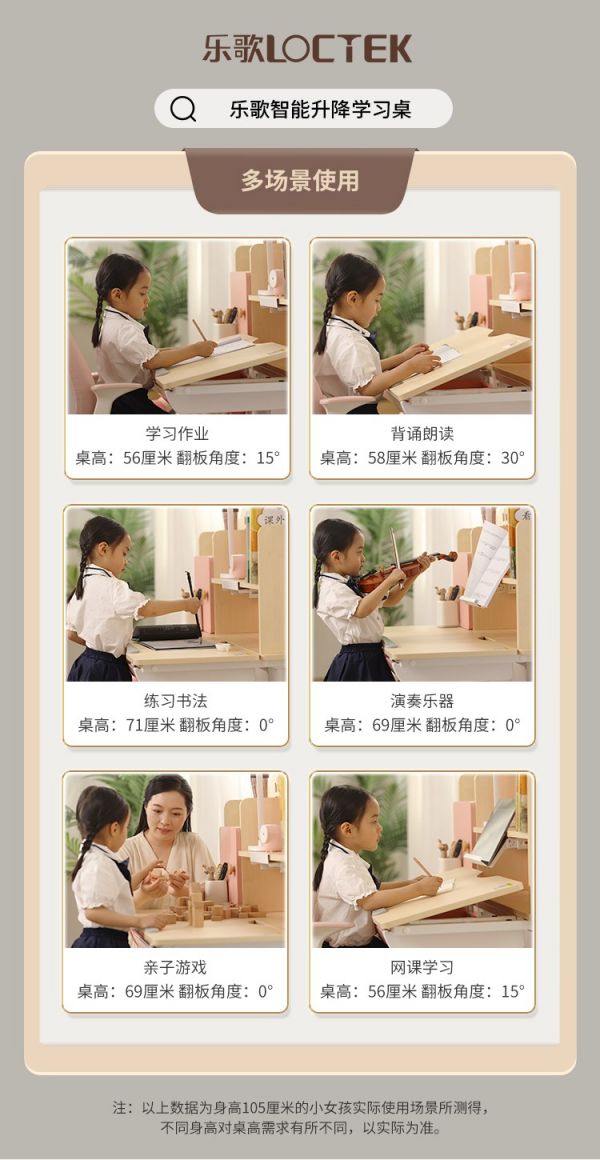 一个人的成长以及习惯的养成和他所处的生存环境有着密切的关系,学习、工作占据了人生很多时间,这些时间的体验都在细微之处影响和塑造着我们。乐歌智能升降学习桌椅帮助建构了一站式的家庭健康解决方案,用一方桌椅成就一家人的幸福身心。