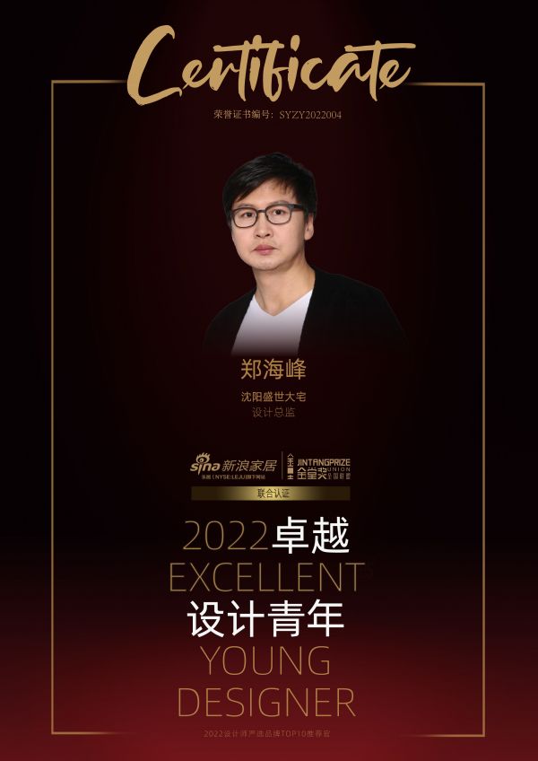 【郑海峰】:很荣幸获得由新浪家居与金堂奖联合认证的“2022卓越设计青年”。感谢我服务过的每一位业主的信任,感谢我的母队盛世大宅的培养,感谢威士伯品牌的支持。