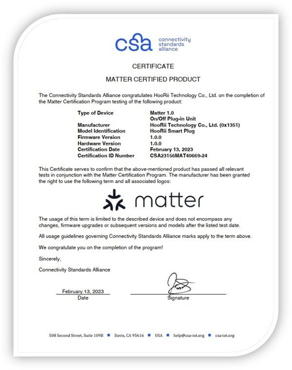 新浪家居智能家居频道讯 2月15日,据和众科技官方消息,和众科技智能插座成功通过Matter1.0协议认证。据悉,本次认证也是和众科技自持的首个Matter1.0品类证书,这意味着在和众科技的帮助下,设备厂商无需经历复杂的认证,可以快速投产Matter设备。