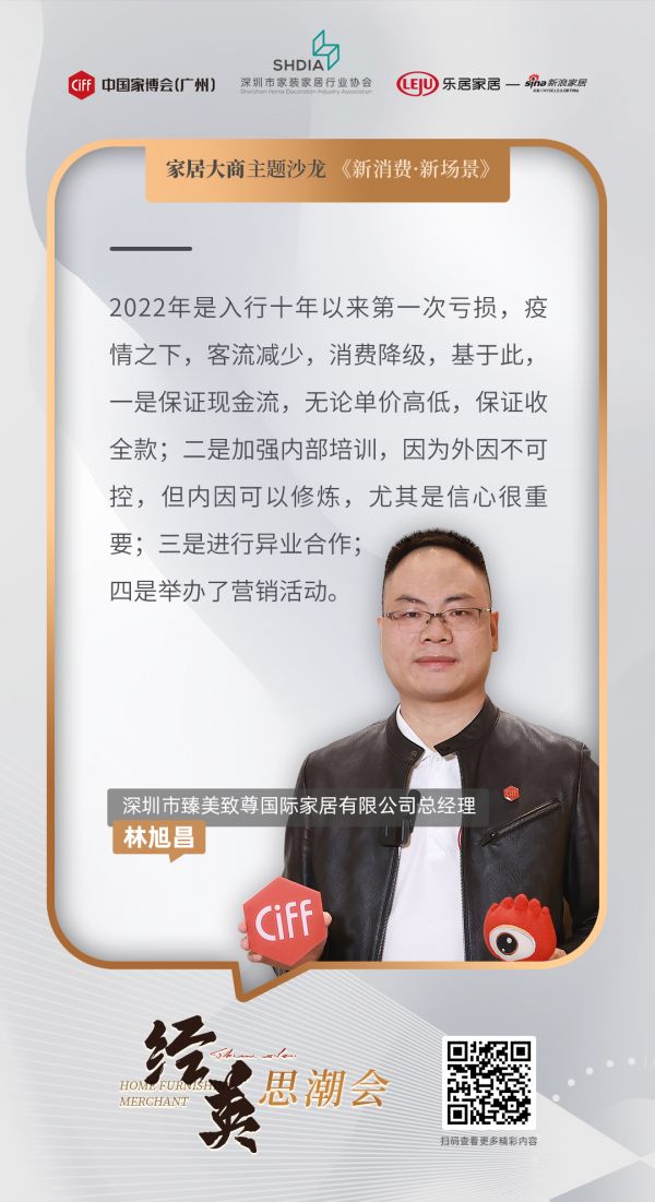 2023年2月23日,《经英·思潮会之新场景新消费》大商沙龙正式举行,本次活动由中国家博会(广州)、深圳市家装家居行业协会、新浪家居联合主办。沙龙中,深圳市臻美致尊国际家居有限公司总经理林旭昌表示:“2022年是入行十年以来第一次亏损,疫情之下,客流减少,消费降级,基于此,一是保证现金流,无论单价高低,保证收全款;二是加强内部培训,因为外因不可控,但内因可以修炼,尤其是信心很重要;三是进行异业合作;四是举办了营销活动。”