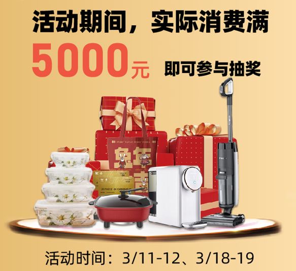 单笔实付金额满5000元,即可在2楼半智慧家电生活馆赠奖处参与抽奖(每人每单抽1次)。从高频使用的电动牙刷到愉悦身心的环球通卡,从冬天必备的电火锅到解放双手的扫地机器人,希望这些精心准备的家居用品可以为消费者的生活增添一些美好!