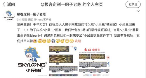 SKYLOONG的国内市场发展之路尤为曲折。在海外市场的几年里,忽视了对中文商标的注册、保护,在回归国内市场之初发现“小呆虫”一名已被抢注,在不得已的情况下改名“拾光龙”,就此开启了国内客制化键盘市场的征程。在不懈的努力下,2023年初,SKYLOONG成功夺回“小呆虫”商标,正式将中文名更换回“小呆虫”。为了庆祝“小呆虫”回归,SYKLOONG拟在3月3日开启“疯狂套件节”活动。创始人老陈透露:届时将有多种福利上线,将有机会以超值价格入手客制化键盘的套件,还有留言对暗号掉落套件盲盒的彩蛋福利等待大家挖掘。可以看出,小呆虫是想要以这样的方式感谢粉丝一直以来的支持,也希望能让更多键盘玩家体验到客制化的趣味。