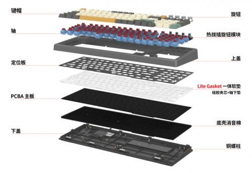 其实GASKET(软弹)结构早先是由国外客制化团队提出的,他们通过垫圈软连接固定,使得键盘整体手感和按压表现软、弹的同时,还能有效降低空腔杂音;但它的结构稳定性较弱,而小呆虫的开发团队对该结构进行了调整、改进,变为 轻弹 Gakset,它既有垫圈的这种软连接的好处,有消音和抑制共振的能力,又有硬连接的结构,保持它的稳定,轻弹 Gasket相关产品推出后迅速得到了市场的认可,充分体现了SKYLOONG小呆虫对客制化市场需求、技术方向的准确判断。