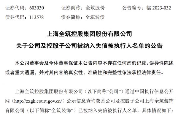 3月4日,全筑股份发布公告,由于部分供应商及恒大票据持有人因公司及子公司未能及时偿付款项或兑付票据而提起诉讼,并对已判决诉讼要求公司及子公司履行生效法律文书的给付义务。由于公司及子公司部分案件败诉后,未能在期限内履行,故被列入失信执行人名单。公司对此表示,公司及子公司被纳入失信被执行人名单将对公司产生一定的负面影响。
