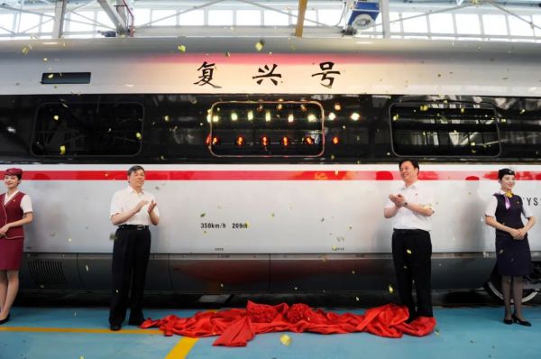 △中国铁路总公司党组书记、总经理陆东福(时任)与刘化龙共同为”复兴号“ 揭幕