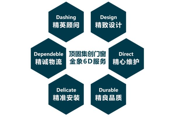 在服务方面,为了让客户省心、放心,顶固集创门窗特别量身打造了行业首创的金象6D服务体系,从销售、设计、安装、维护、品质、物流六个方面为客户提供24小时不间断的高品质无忧服务,真正用心服务好每一个客户。