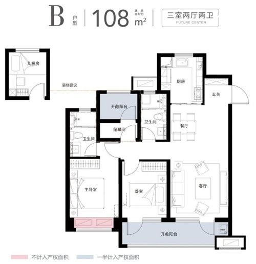108㎡三室两厅两卫,动静分离,南北通透,通风良好,采光面很大,都是带窗户的明厨明卫,打造明亮温暖的人居体验;