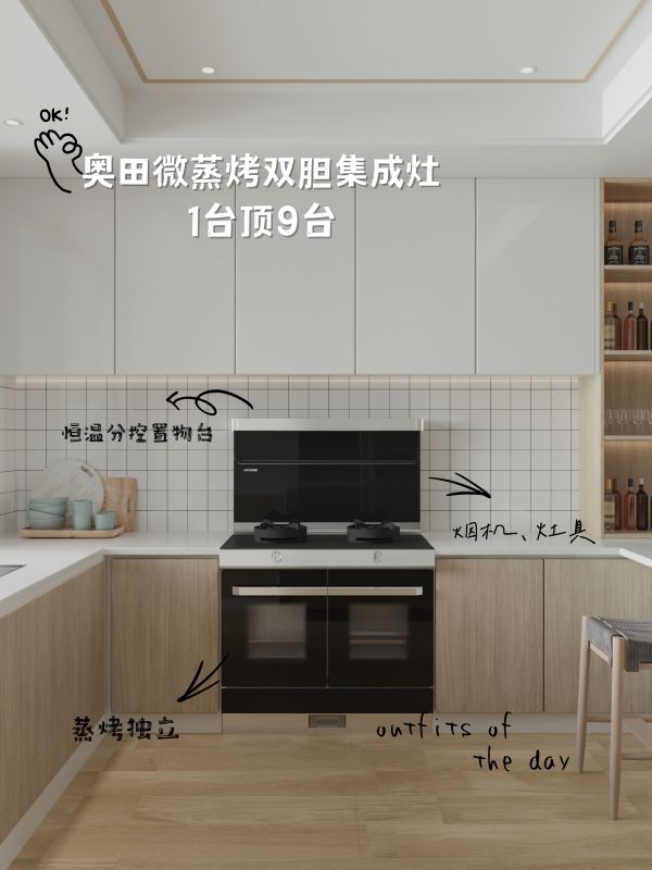 现代厨电被开发的五花八门,大家除了购买传统烟灶,蒸烤箱、消毒柜、微波炉、空气炸锅等样样不落下。同样的厨房空间,相比被各种电器占据支配空间,为什么不选择1台顶9台的奥田微蒸烤双胆集成灶来的省事。仅占地1㎡,吊柜还能用来储物,重点还能避免厨电“闲置”!
