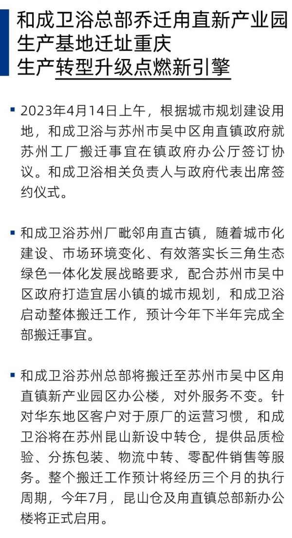和成卫浴总部乔迁甪直新产业园,生产基地迁址重庆