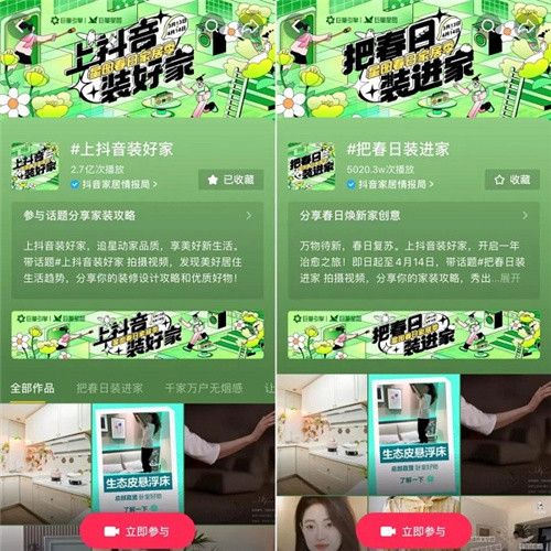 基于对家居人群的洞察,策划#上抖音装好家 母话题活动做种草内容的展示和承接,又针对家居生活热点专门打造子话题#把春日装进家,邀请优质达人分享各自领域的春日宅家积极生活态度。