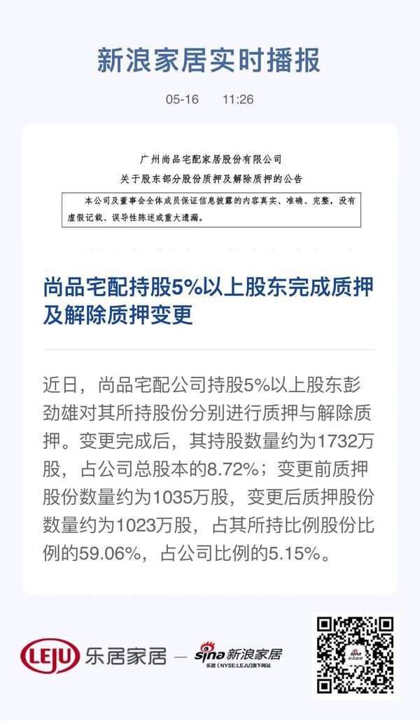 定制快讯|尚品宅配股东彭劲雄解除质押66万股