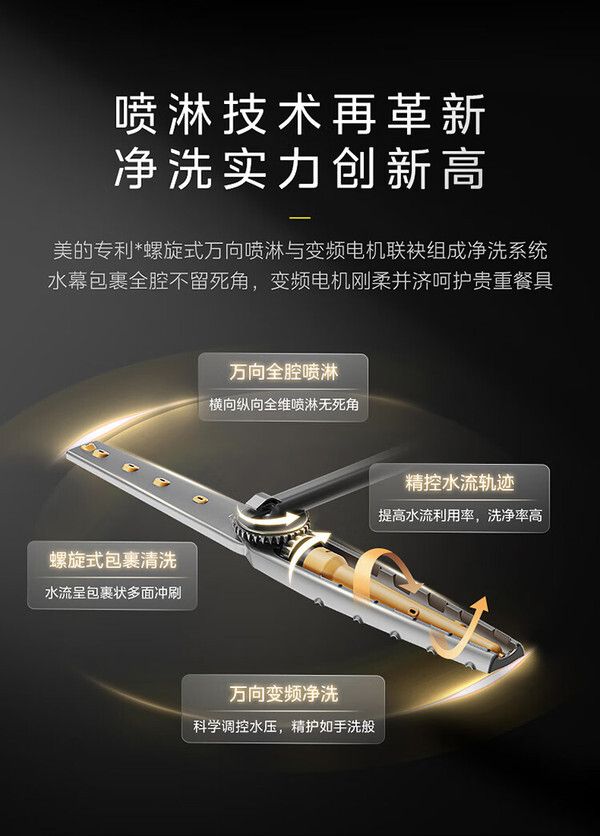 作为国内家电业的龙头企业,美的的商业版图纵横各个领域,同时也积淀了深厚的全品类技术能力。而为了提升消费者的净洗体验,美的针对特殊餐具或局部区域清洁效果欠佳,研发出万向喷淋技术,洗碗机上层碗篮喷臂可360°旋转,全腔清洗无死角,相比普通喷臂74%的覆盖率,喷射面积提升32.4%,清洁指数大幅得到提升,洗净效果提升8.3%。