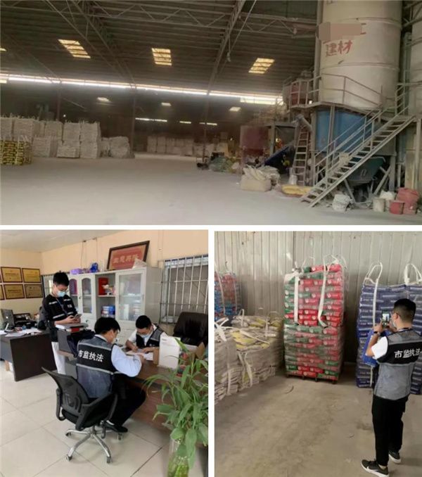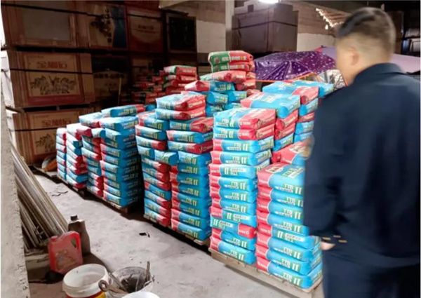 佛山三水市监查处1个山寨仓库,查扣20kg雨立停瓷砖胶198包、包装袋1498个。