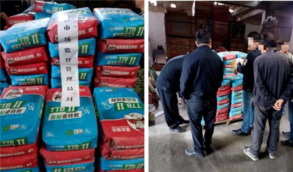 湖南株洲市监查处1个销售山寨门店,查扣341包德高精装Ⅱ型瓷砖胶。