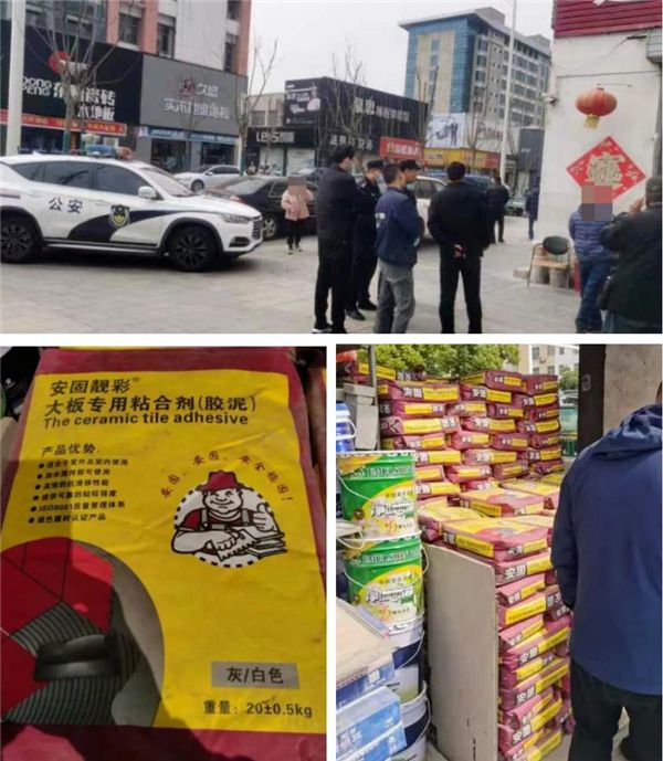江苏灌云市监查处1个门店山寨,查扣安固靓彩瓷砖胶190包。