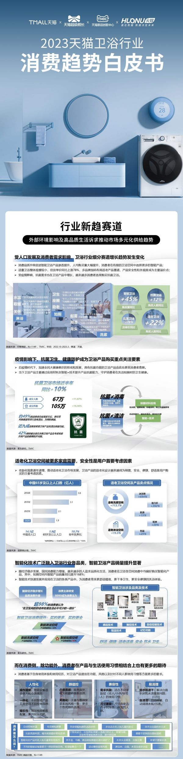 “宏观环境变化加速中国卫浴线上市场发展,此背景下,天猫卫浴行业联合天猫新品创新中心(TMIC)以及火奴数据共同发布《2023天猫卫浴行业消费趋势白皮书》,深入分析行业新趋赛道发展现状,将卫浴空间划分为洗漱、淋浴、如厕三大功能分区,全生命周期透视不同功能分区的消费者决策链路特征,聚焦“以人为本”,洞察卫浴行业发展六大新趋势,帮助品牌挖掘产品创新机会点。” 眼下,618天猫家装预售全面开启,更多好货好价上天猫~~