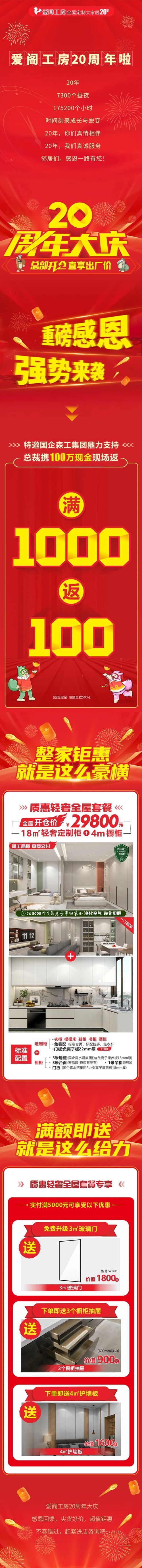值此20岁生日之际,爱阁工房#20周年大庆主打一个感恩回馈,特邀国企森工集团鼎力支持,总裁携100百万现金现场返,满1000返100;总部开仓 直享出厂价,质惠轻奢全屋套餐18m²轻奢定制柜+4m橱柜只要29800元,满额即送,免费升级玻璃门,下单即送橱柜抽屉和护墙板,用实实在在的价格、品质与服务感谢邻居们一直以来的坚定选择,就是这么豪横,就是这么给力,钜惠福利嗨不停,让你邂逅一场超低价格、超级贴心的家装之旅,惊喜不容错过,赶紧到爱阁工房各大门店咨询吧~
