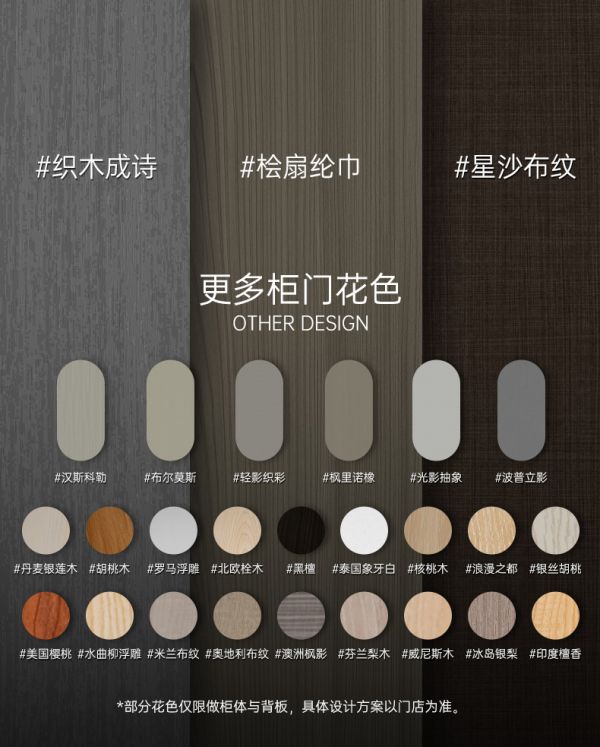 这次套餐为大家提供了多种柜门板的花色,有汉斯科勒、丹麦银莲、胡桃木、布尔莫斯、轻影织彩等。多种花色可以随心搭配,搭配出你最爱的家居风格。我们还会提供多种风格参考,有简约风、奶油风、现代轻奢风、简欧风,总有一种风格会让你心动。