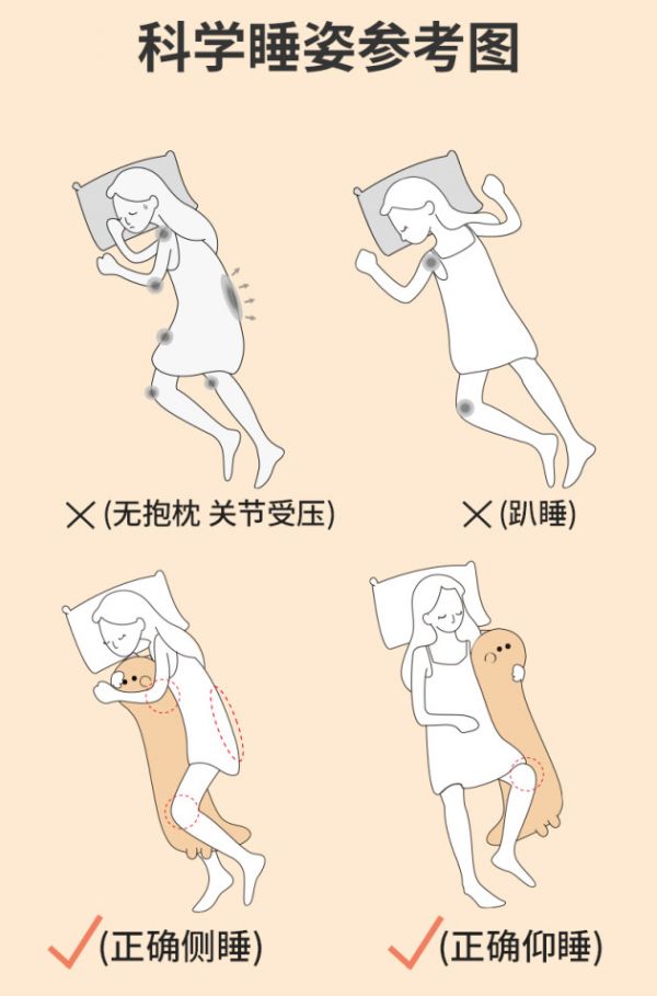 健康睡姿影响着身体的许多方面:颈椎健康、腰椎健康、血氧浓度、呼吸系统等等,其中颈椎健康和腰椎健康是最主要的关注点。这就代表着你需要在各种睡姿中,找到合适支撑物,让你的颈椎和腰椎舒适放松,这时候你需要找到一个合适的枕头和一个专业的睡觉抱枕。