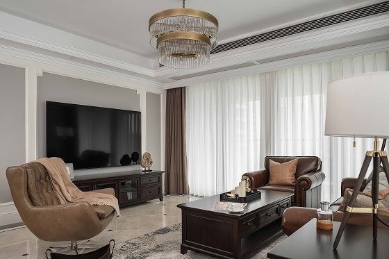 步入客厅区域,大平层的户型结构与大面积的落地窗自然地消解了封闭与压抑,为整个空间注入灵魂。