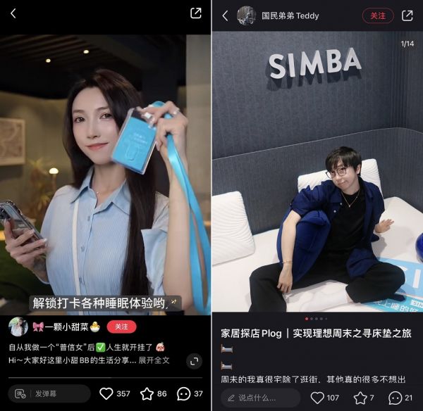 来到“松弛睡眠充能站”的博主和达人,制作探店打卡内容反哺线上传播,在以内容为驱动的口碑阵地——小红书上发布“SIMBA丝姆巴松弛睡眠充能站”的睡眠体验,借由达人声量助推SIMBA丝姆巴品牌声量最大化。