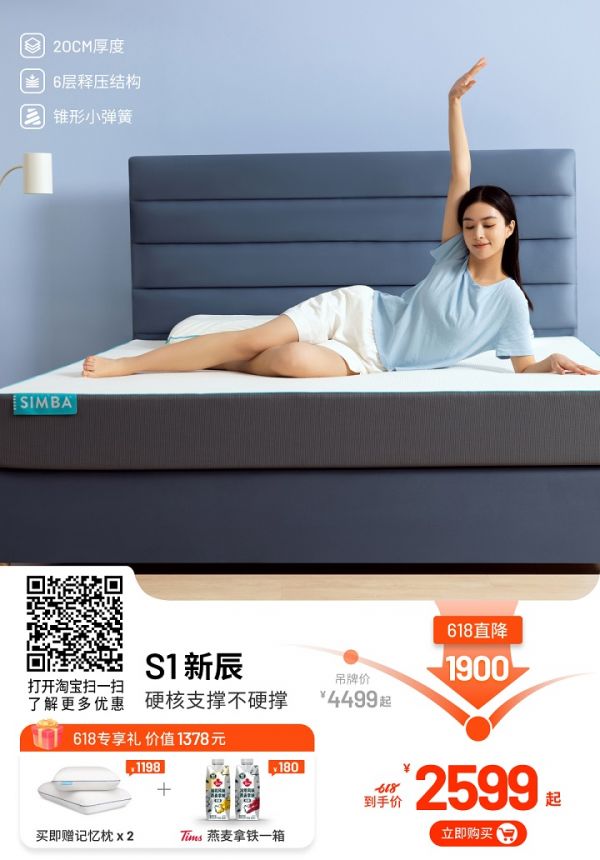 来自英国的睡眠科创品牌 SIMBA 丝姆巴创⽴于2015年,品牌致⼒于睡眠领域引领创新,全球累计销售超1,000,000个睡眠产品,是目前世界上最1受欢迎的床垫之⼀。作为SIMBA 丝姆巴的全球旗舰店款——Simba H3 新能床垫更是多次获得英国年度产品大奖。从线上到线下,SIMBA 丝姆巴致力于通过场景体验、多渠道种草、全链路运营的方式,来打通消费者与产品之间的互动通道。而今年,SIMBA丝姆巴专门为中国市场用户研发上市的S1床垫,配备了1645个专利锥形小弹簧,6重释压,灵敏贴合,精准呵护,保障你的睡眠质量。