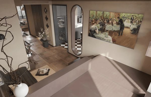 这套法式公寓是一位单亲妈妈的温暖港湾,工作之余她更希望有个温馨的刷剧空间,简单而治愈的空间氛围可以帮她卸下疲惫、从容育儿、享受生活。电视与沙发并不是常规的对视布局,这让空间显得更为开阔,也提供了两种刷剧姿势:坐在单人椅上或者斜躺在沙发上。