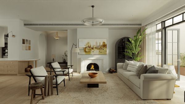 在这个大平层里,业主希望能感受到轻松惬意如美式田园般的生活。全屋空间打开视线通透,整体家居元素和谐自然,色系采用原木色、米色、橡木色,辅以天然石材、大株植物,搭配弧形线条、线型灯具、壁炉元素,打造出松弛感与艺术感兼具的惬意生活。