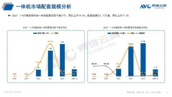 根据奥维云网(AVC)地产大数据显示,2023年1-4月,商品住宅精装开盘项目总计341个,同比-27.4%,精装规模22.09万套,同比-37.8%。其中厨电六件套(烟灶消洗、单功能机、一体机)精装配套项目333个,同比-26.5%,精装规模59.98万套,同比-33.3%。